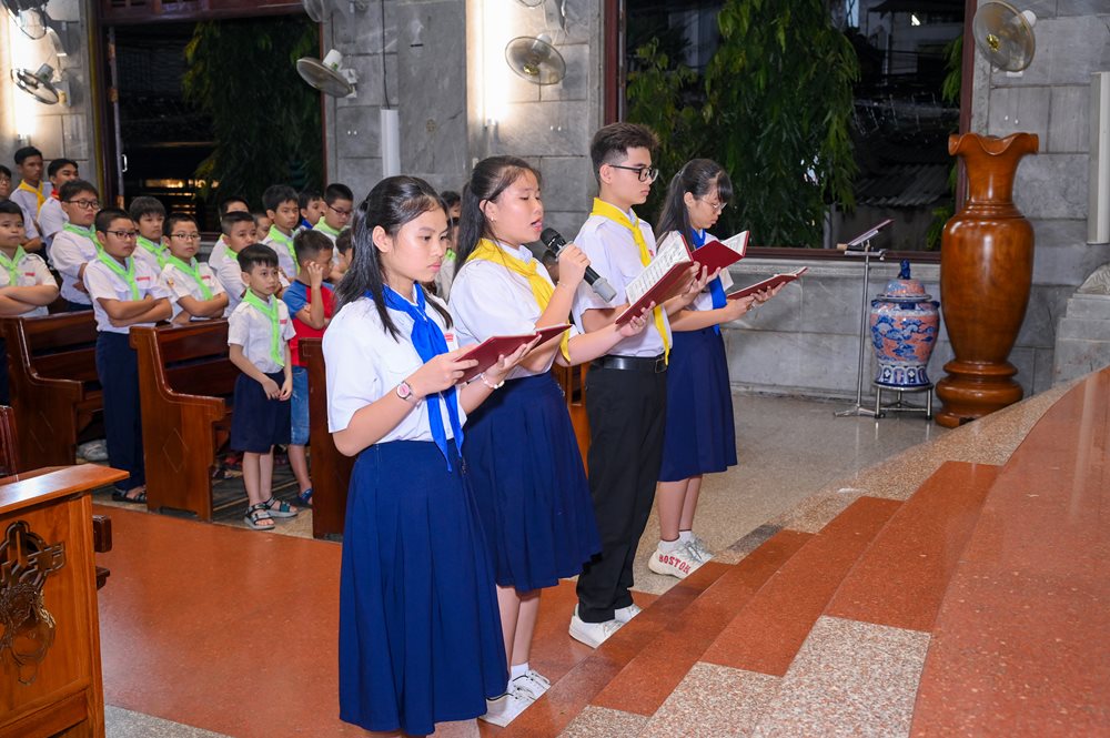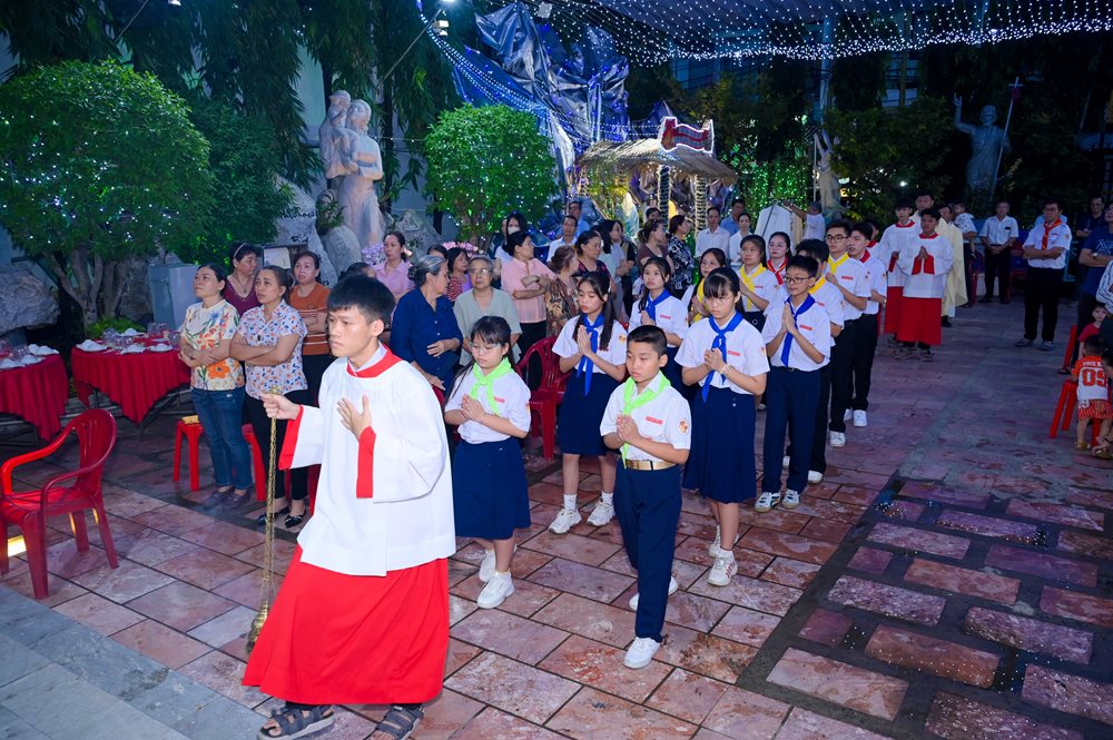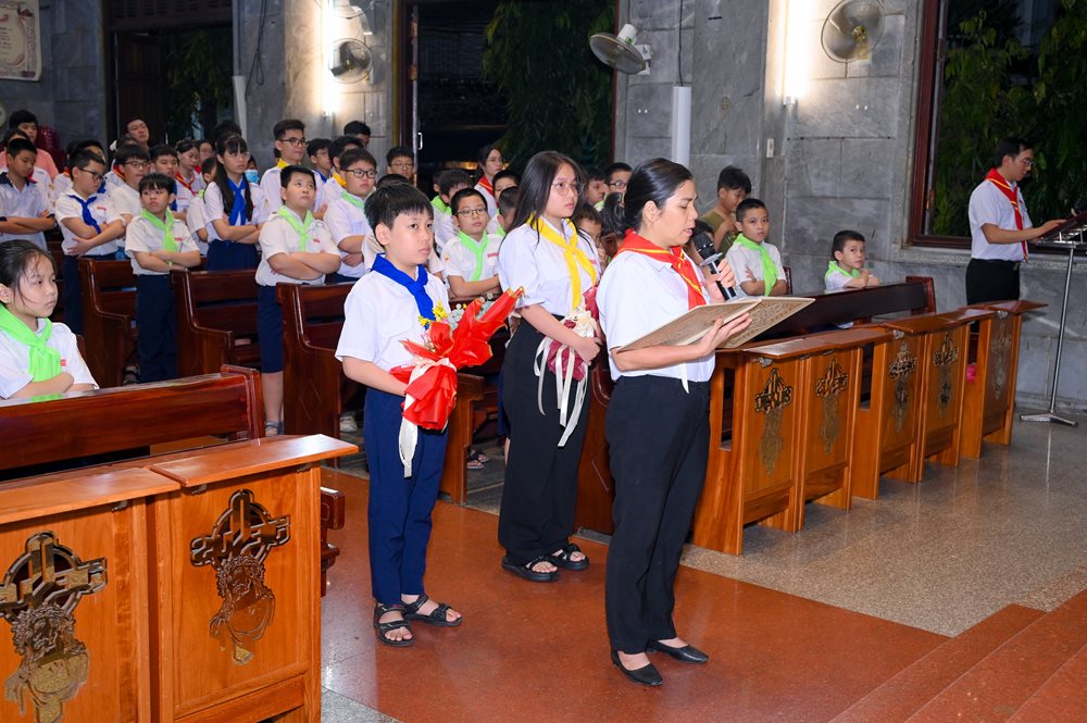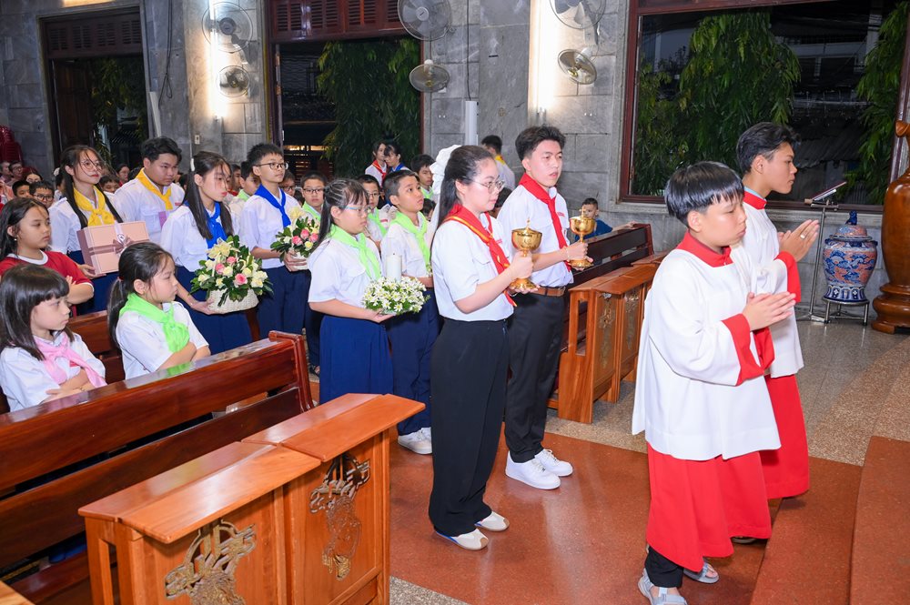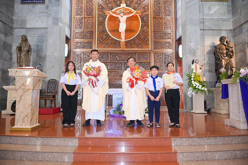 Thánh lễ kết thúc lúc 18g30, cộng đoàn hân hoan lãnh nhận ơn bình an và lưu lại tấm hình kỷ niệm trước thềm cung thánh. Trước khi ra về, các anh chị huynh trưởng - giáo lý viên đã trao cho mỗi em thiếu nhi tham dự Thánh lễ một hộp bánh nhân dịp mừng bổn mạng.