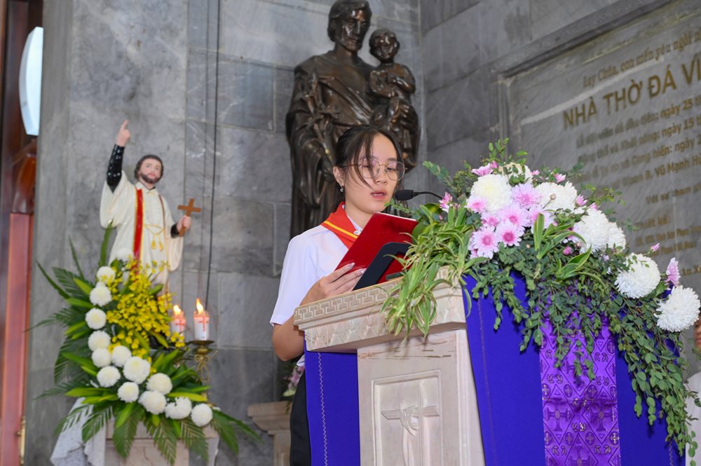 Sau lời nguyện hiệp lễ, chị đoàn trưởng đại diện Đoàn TNTT lên cảm ơn các linh mục và cộng đoàn đã hiệp dâng Thánh lễ cầu nguyện cho Đoàn.