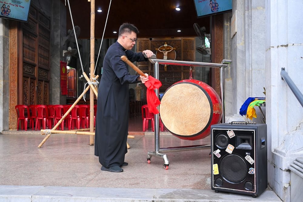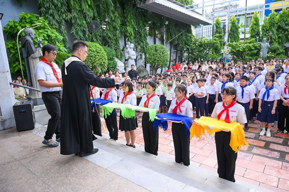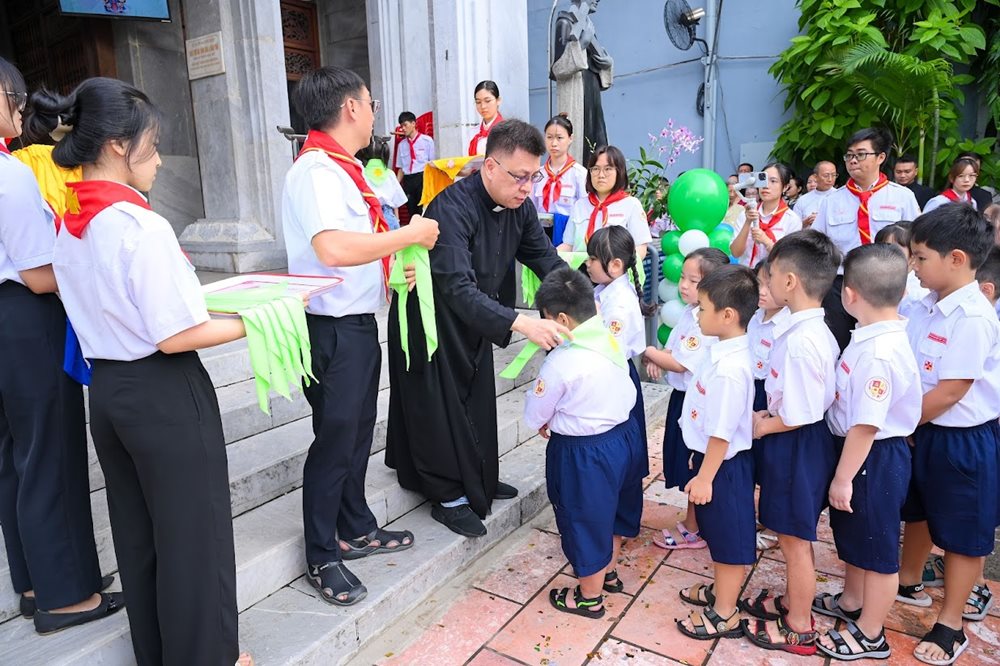 Sau đó, linh mục Martinô đánh hồi trống khai giảng, gửi gắm ước mong năm học Giáo lý mới được khởi đầu trong tinh thần hăng say, hứng khởi và tràn đầy hy vọng. Ngài cũng chủ sự nghi thức làm phép khăn quàng và trao khăn cho các em trong bầu khí trang nghiêm, xúc động.