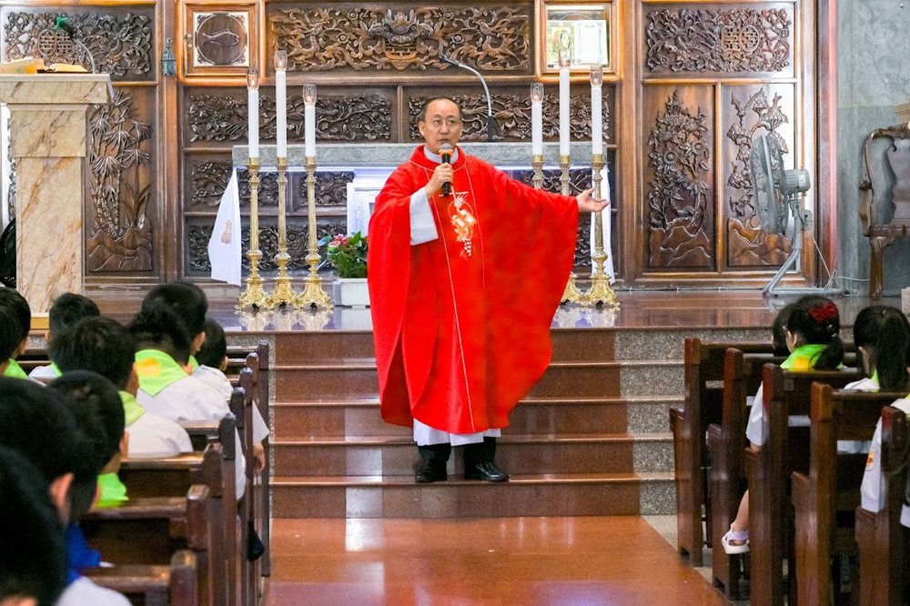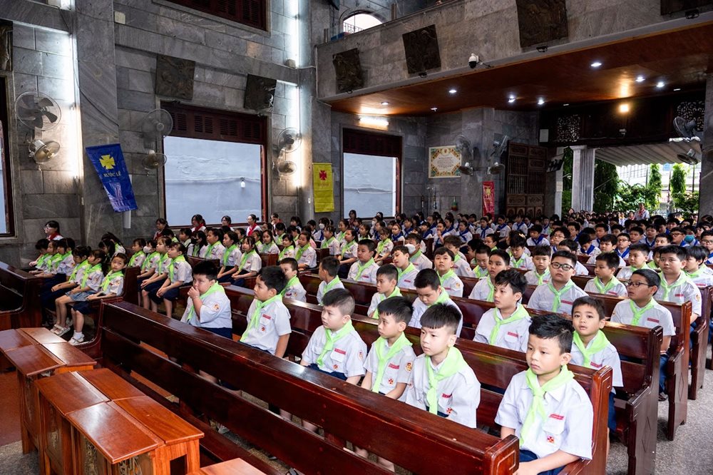 Hiệp dâng Thánh lễ, ngoài các em thiếu nhi, còn có các thầy Dòng Linh mục Thánh Tâm Chúa Giêsu, các nữ tu Dòng Mân Côi Chí Hòa, cùng phụ huynh và cộng đoàn giáo xứ.