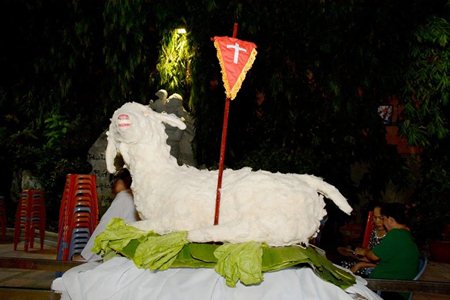 Trước Thánh lễ, 12 ông Tông đồ, quý vị đại diện trong HĐMVGX, các em Ban Lễ sinh cùng cha chủ tế rước Chiên từ trước sân nhà thờ vào trong ngôi thánh đường.