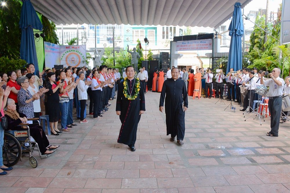 Vào lúc 16g00, trong giai điệu hân hoan của bài ca nhập lễ, đoàn đồng tế được rước từ sân nhà xứ vào nhà thờ.