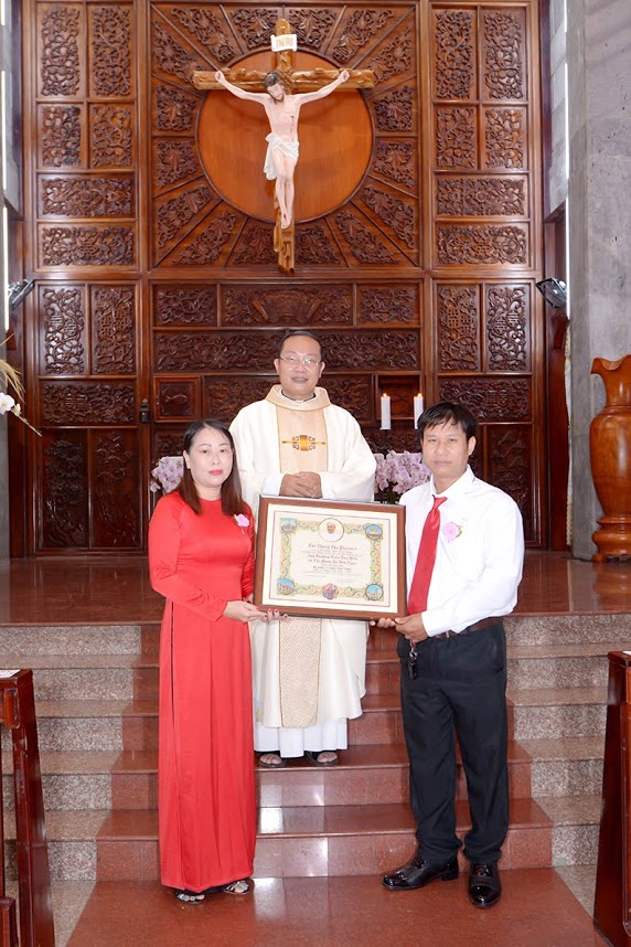 Sau lời nguyện hiệp lễ, các đôi Hôn phối có tên trong danh sách lần lượt tiến lên Cung thánh lãnh nhận “Phép lành Tòa Thánh” từ tay Lm Chánh xứ nhân kỷ niệm ngày Hôn phối.