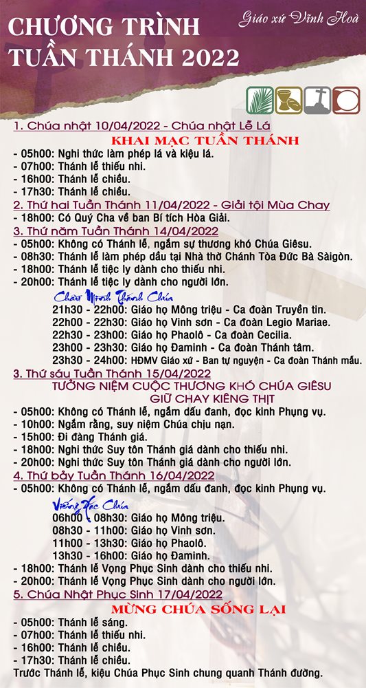 HĐMV Giáo xứ Vĩnh Hòa, xin thông báo đến cộng đoàn những ngày lễ trong Tuần Thánh 2022.