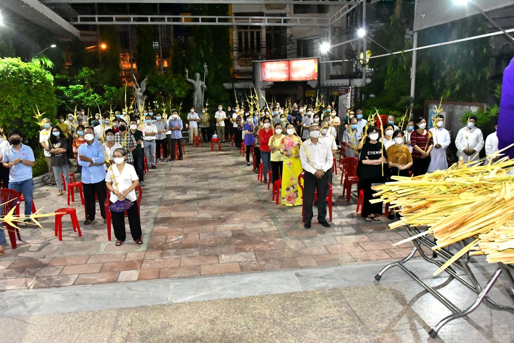 Trước thánh lễ, Lm Chánh xứ cùng cộng đoàn cử hành nghi thức làm phép lá ngay tiền sảnh nhà thờ. Sau đó, Lm chủ tế, các em Lễ sinh cùng cộng đoàn cầm cành lá trên tay tiến vào ngôi thánh đường trong niềm hân hoan.