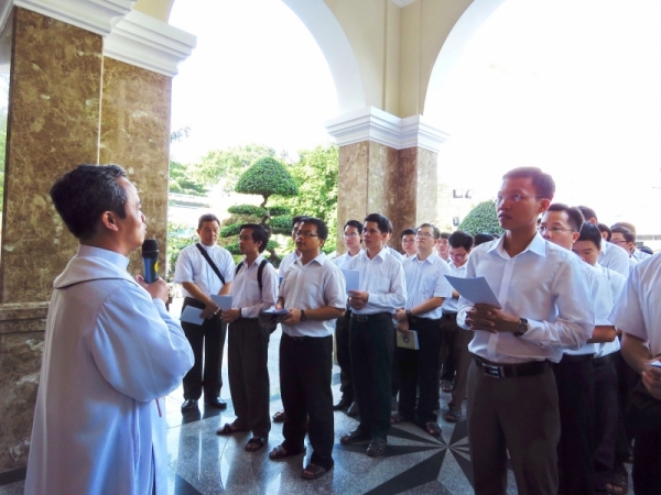 Bắt đầu từ 7g30, dưới sự hướng dẫn của Lm Giuse Đỗ Quang Khang và Lm Phaolô Nguyễn Quốc Hưng, quý thầy đã đi bộ đến họ đạo Thị Nghè.