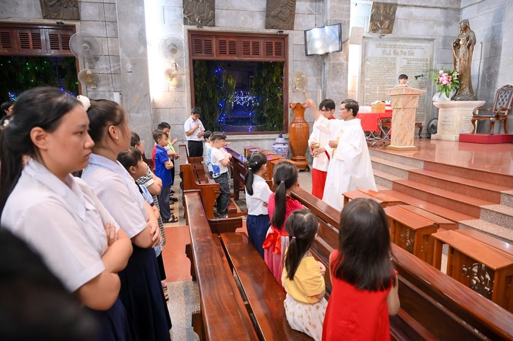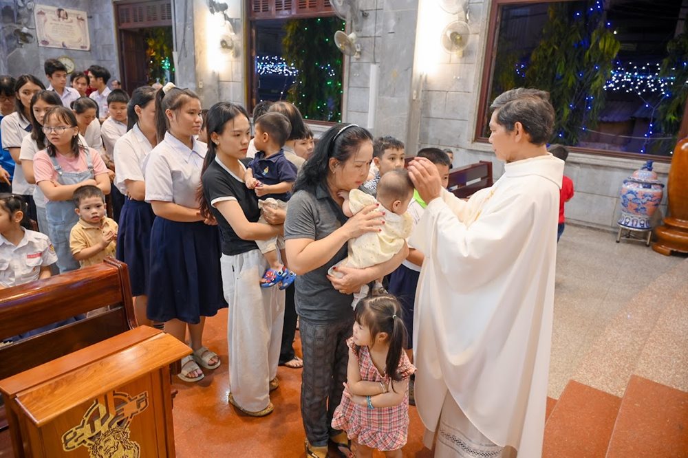 Trước khi ra về, các bậc phụ huynh bế các em nhỏ xếp thành hai hàng tiến lên trước thềm cung thánh để linh mục Gioan Baotixita Trần Quang Hiển đặt tay và chúc lành cho các em.